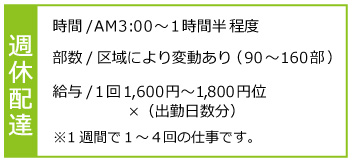 ご覧いただきありがとうございます。 道新なかたでは、配達スタッフを募集しています。 ※3ヶ月継続で3万円支給。朝刊配達・週5日以上勤務の方対象 【お問合せ】分からない事などありましたら、お気軽にご相談ください。 【応募方法】事前にお電話ください。面接の日にちを決めますので、当日写真付履歴書をお持ちください。(面接は忠和店にて行います。) 【担当】 忠和店/0120-487-855